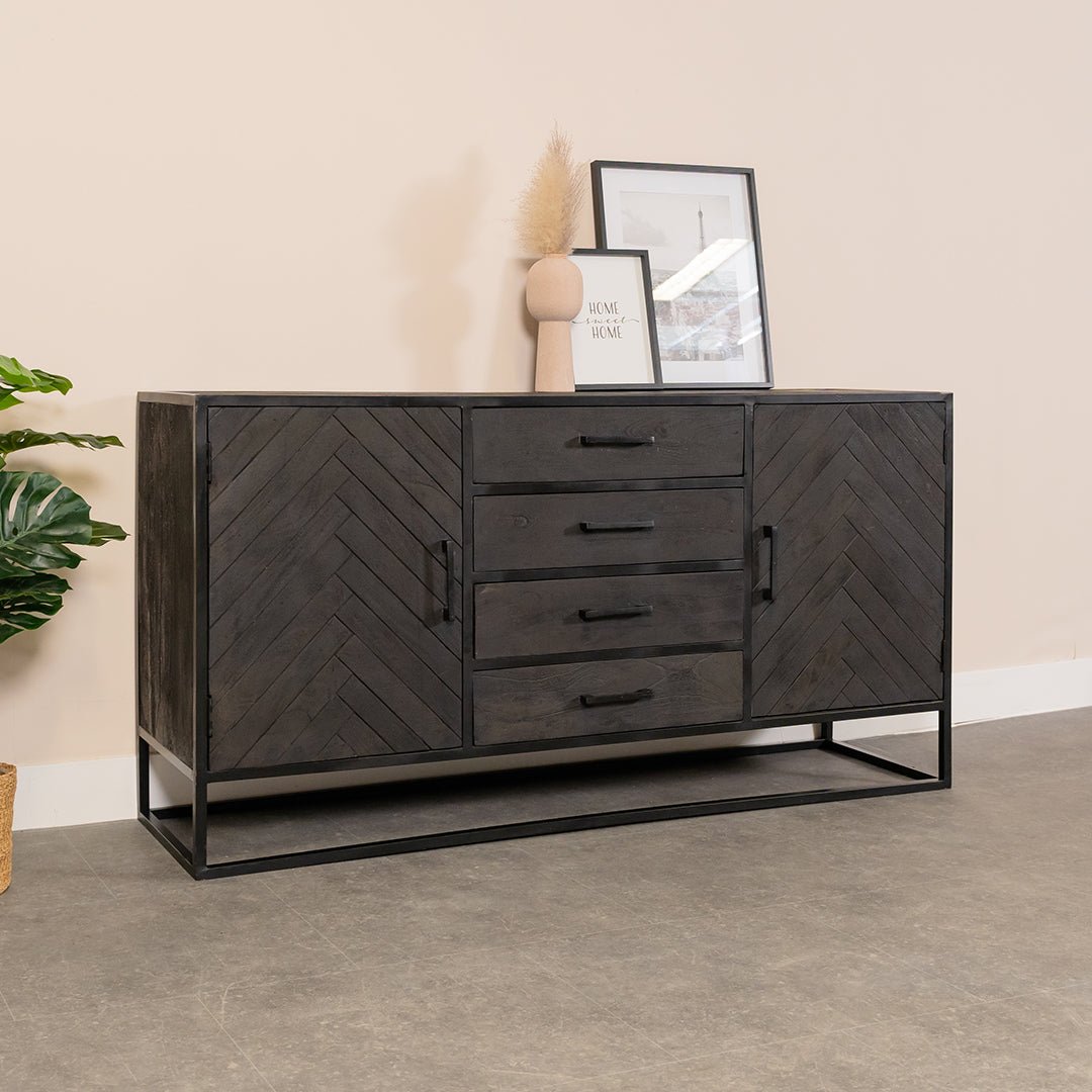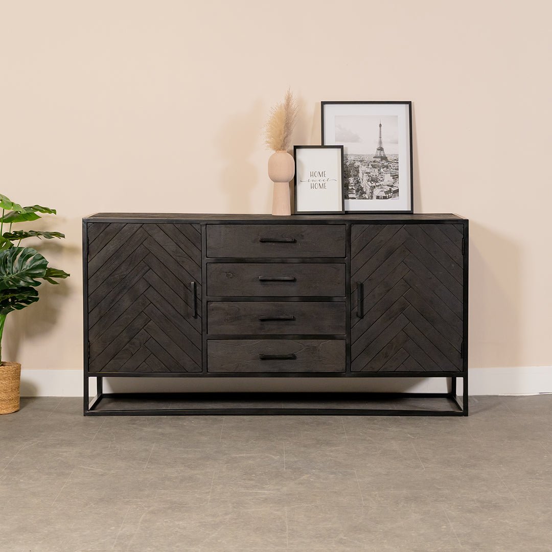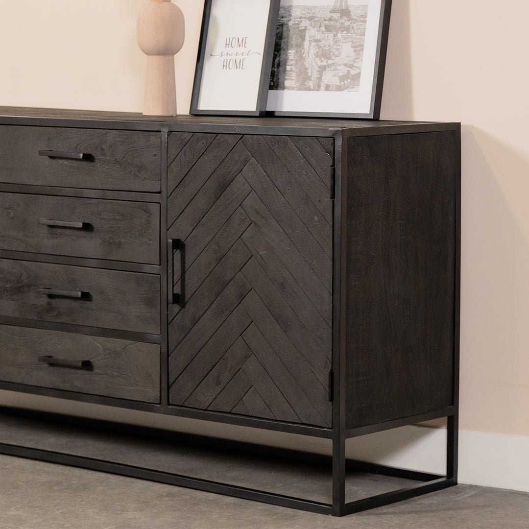 Dit stoere zwart mangohouten Dressoir Yara heeft een prachtig visgraat patroon. En dat maakt dit Dressoir ook direct erg chique. De stijl van dit dressoir zit tussen een industriële stijl en een moderne hotel chique stijl in. Afhankelijk van de andere meubels waar je dit mooie dressoir mee combineert komt het compleet anders uit de verf.