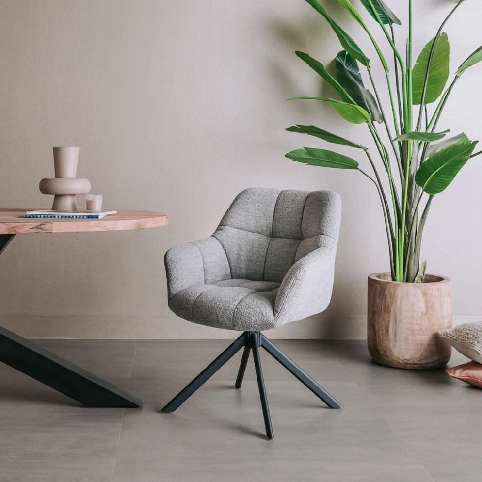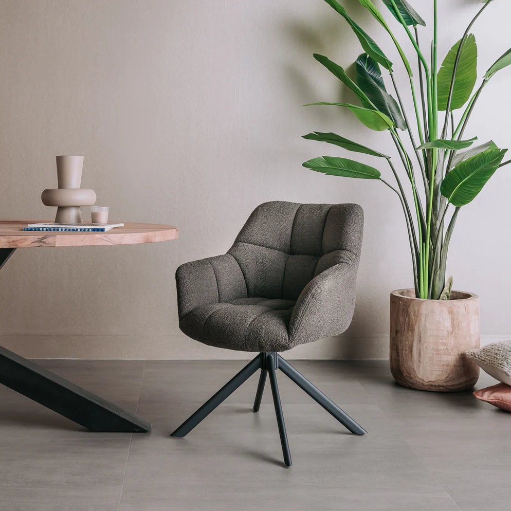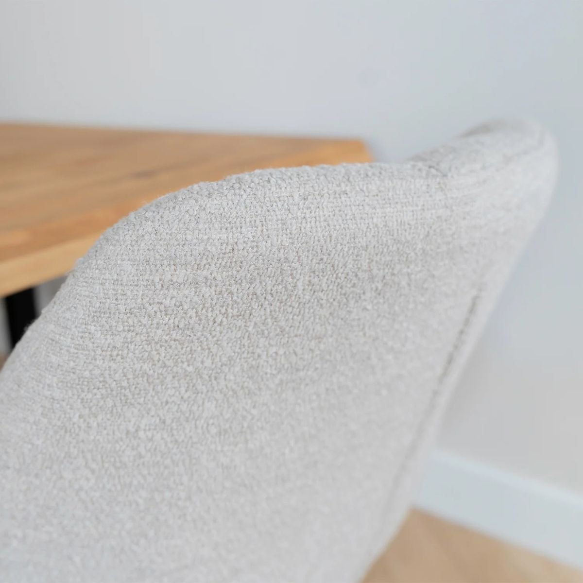 Eetkamerstoel Alba is een zeer comfortabele eetkamerstoel uitgevoerd in de zeer trendy Bouclé stof. Deze stof is zacht en warm en geeft uw interieur een zeer moderne en chique uitstraling.