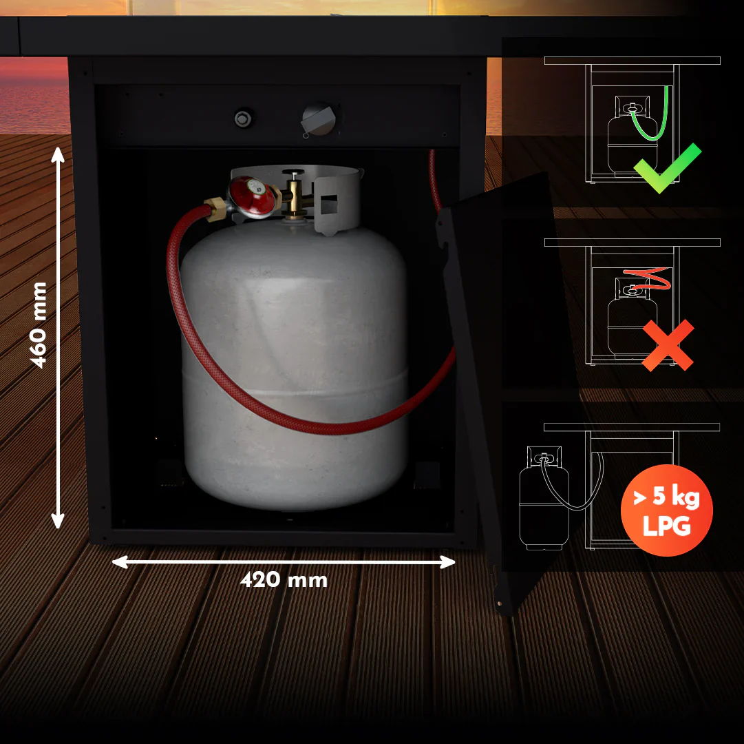 Het geïntegreerde gaskompartiment verbergt de gasfles, waardoor je buitenruimte strak en stijlvol blijft. Geen zichtbare gasflessen, alleen een moderne en sfeervolle vuurtafel.