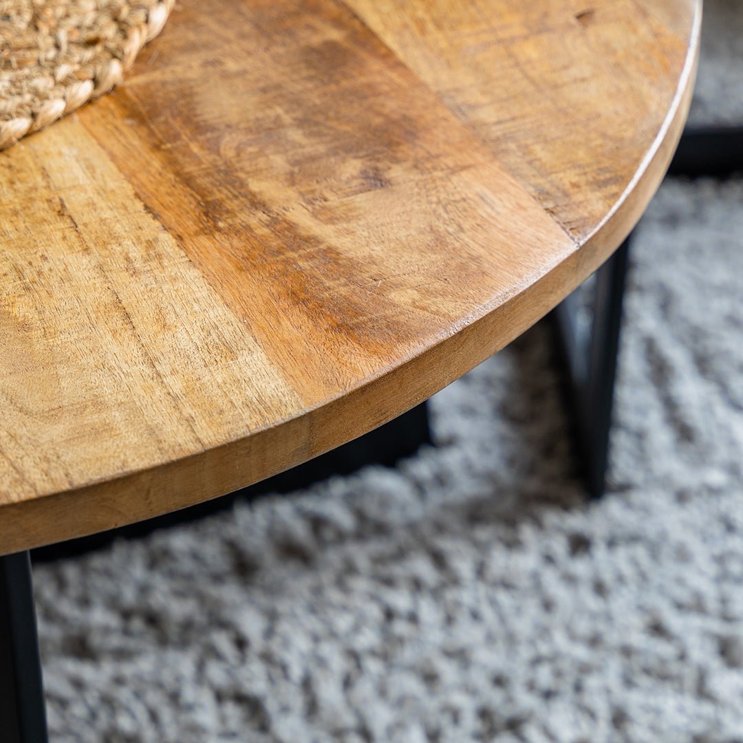 Deze mooie ronde mangohouten salontafelset is een mooi design voor in de woonkamer. Het metalen frame in combinatie met het robuuste mangohout vormen een trendy samenstelling die makkelijk combineert met andere meubels.