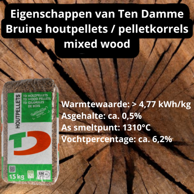 Ten Damme Bruine houtpellets / pelletkorrels mixed wood – gezakt 66 x 15 kg. 990kg. ENplus A1 .